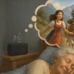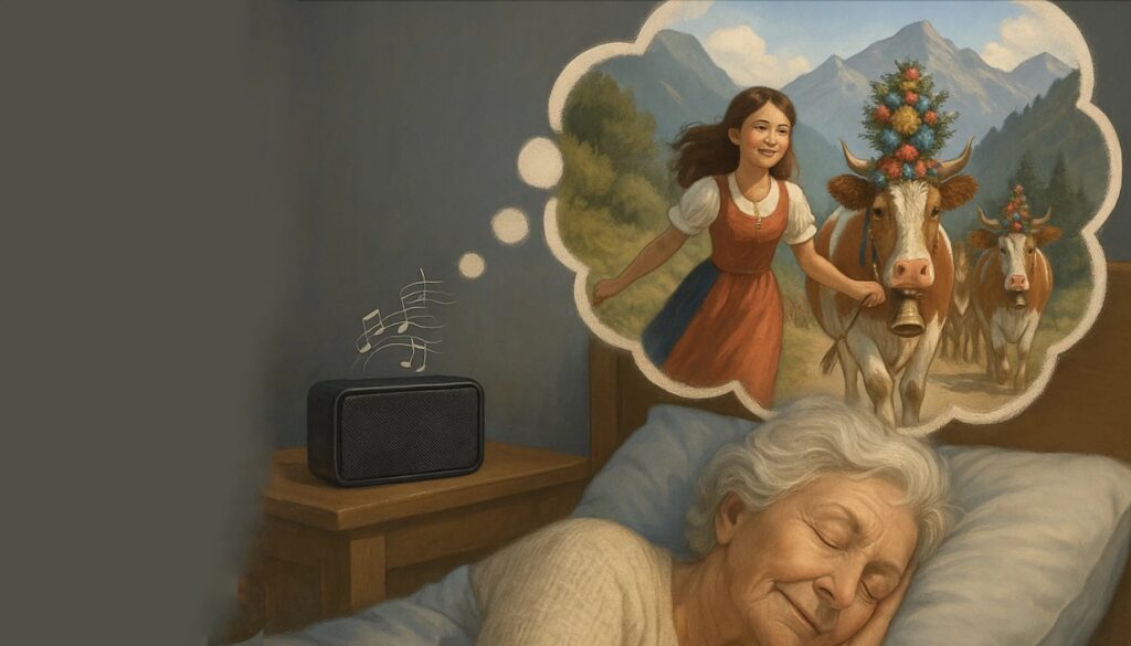 In de weken daarna ontdekte ik dat ze geboren is op een boerderij in Oostenrijk. Ze vertelde over haar broers, over op zondag naar de kerk, over koeien naar de bergweide brengen. Het mooiste is: ze slaapt nu weer. Met het geluid van een stromend beekje, vogels, bijen en koeienbellen. Geluiden die ik vond onder “Sounds Alpenweide”.